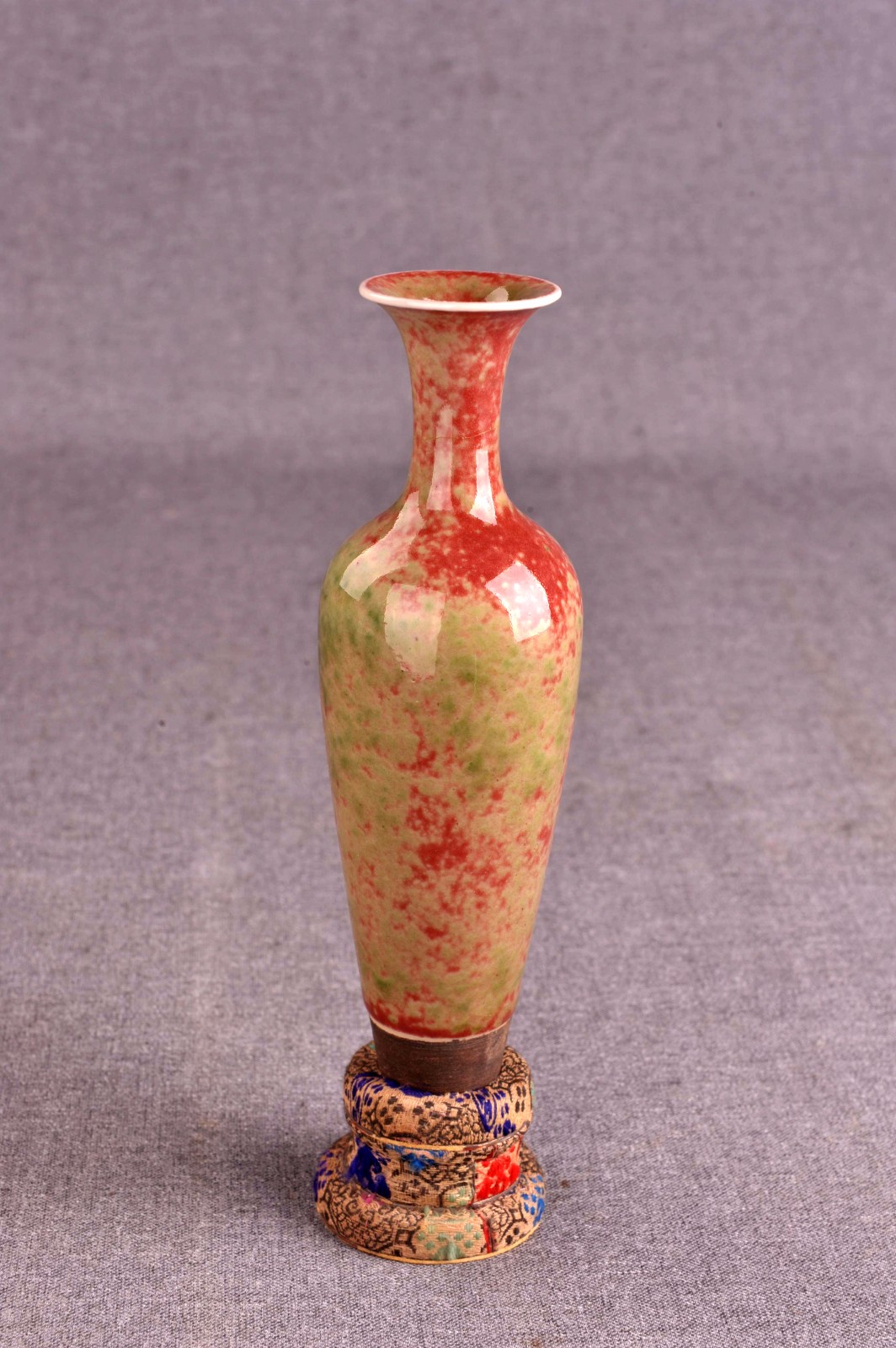 康熙美人醉柳叶瓶,高16厘米,口径3.5厘米,底径2厘米。敞口,溜肩,瓶身清秀细长,形似柳叶,小巧玲珑。全器表里釉色均呈现豇豆红、苹果绿斑点,色泽莹美...