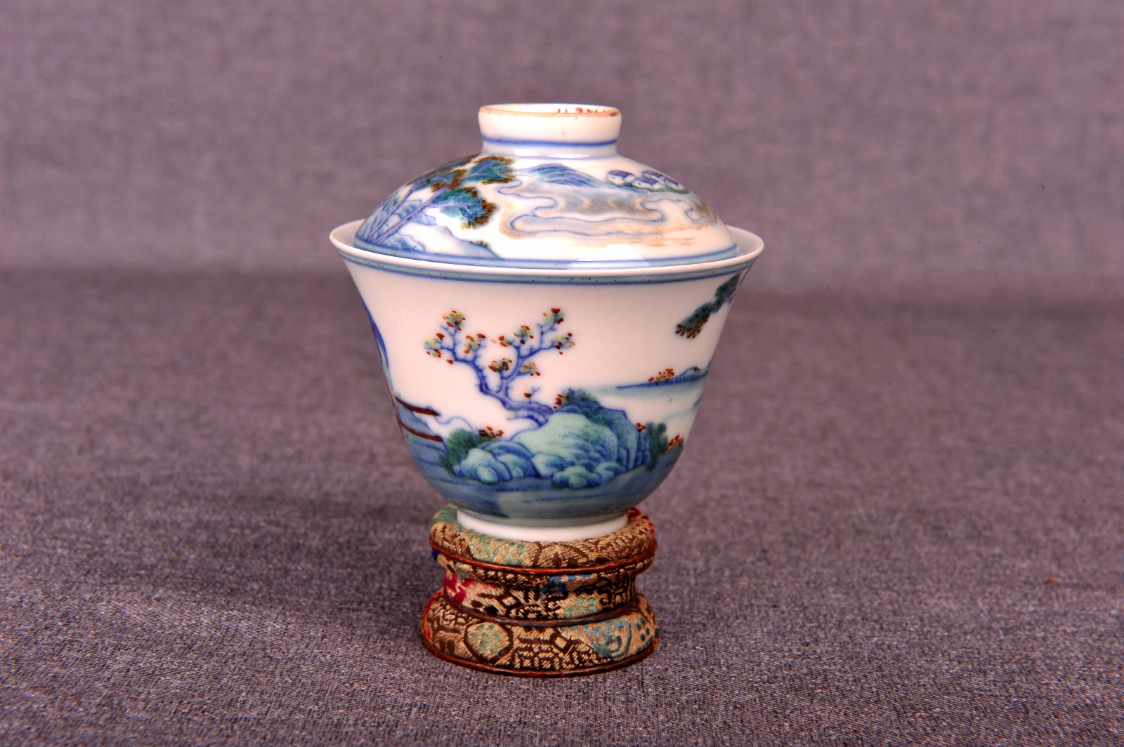 查看更多内容1976年贵州省博物馆收购的“尘定轩”斗彩山水人物盖碗,通高6.8厘米,口径6.7厘米,足径2.7厘米。敞口,圈足,盖可作倒置小碟,盖顶圈钮。此盖碗体...