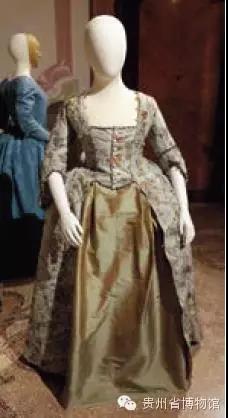 这是一件蓝色丝绸女士长裙。彩色丝线织锦的装饰图案是开着花的树枝和波纹构成浅色的底纹。起源于披风的18世纪典型的背部宽松女士长袍,在世纪之初就已为人所熟悉,格拉德尼戈家族的记事员曾经在1721年记录过这种特殊的服装结构。从18世纪50年代起,为了令宫廷接受,意大利北部的艾德里安式(Andrienne)拖裙逐渐失去了不拘礼节的原始特色,70年代末期由于玛丽•安托瓦内特塔皇后宫廷的青睐,它得以重回时尚舞台。