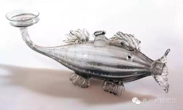 模具吹制,饰有水平楞纹,缠绕着螺旋状的“向日葵玻璃”丝,加工时进行碎裂。瓶口、背鳍和腹鳍为焊接,冷却后用镊子加工。眼睛为“向日葵玻璃”,带有黑点。一些学者认为这可能是一件意大利中部(托斯卡纳)仿制穆拉诺的玻璃制品。
