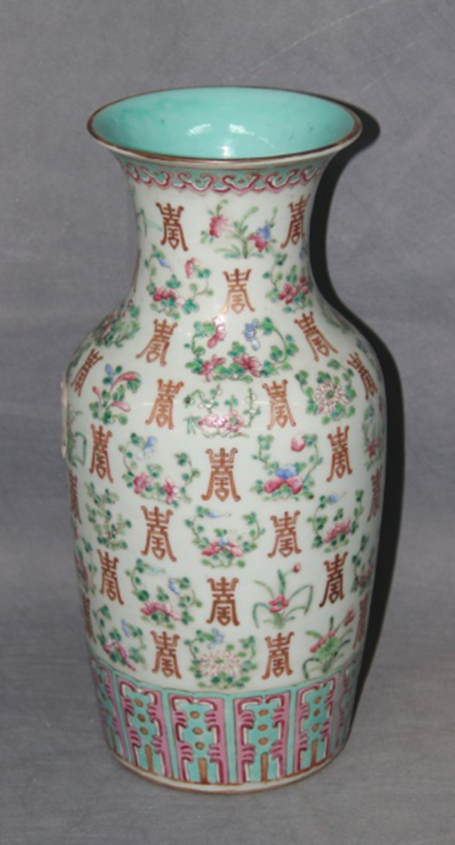 瓷瓶撇口,直颈,溜肩,直壁内收,内凹圈足。通体绘红彩描金寿字及各色吉祥花卉,寓意长寿富贵。瓶内通体施松石绿釉,瓶口描金。此瓶有可能为庆寿寿礼。