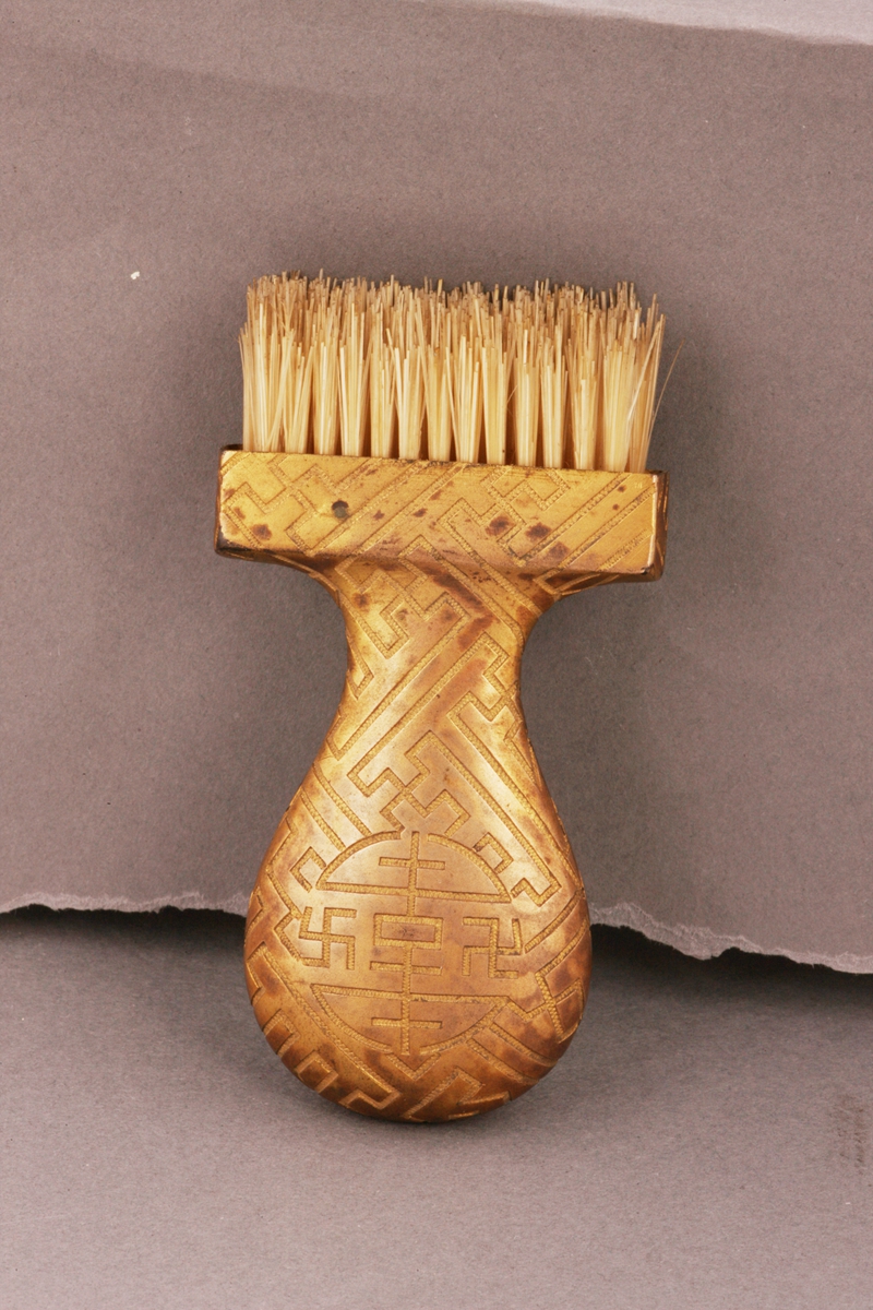 手刷柄为铜镀金,镀金柄上装饰以东方风格的“万”字纹饰。