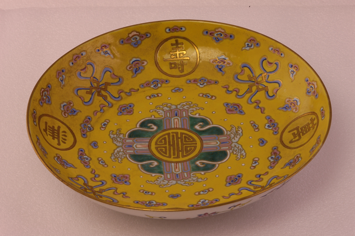 敞口,弧壁,圈足。盘外壁饰缠枝花卉,盘内于黄釉地上以金彩书“万寿无疆”四字,间绘万字绵长纹、如意朵云等。底书红彩六字楷书款“大清光绪年制”。