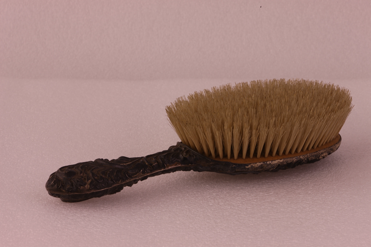 手刷呈椭圆形,背部及手柄银制,饰镀金茛苕叶纹。