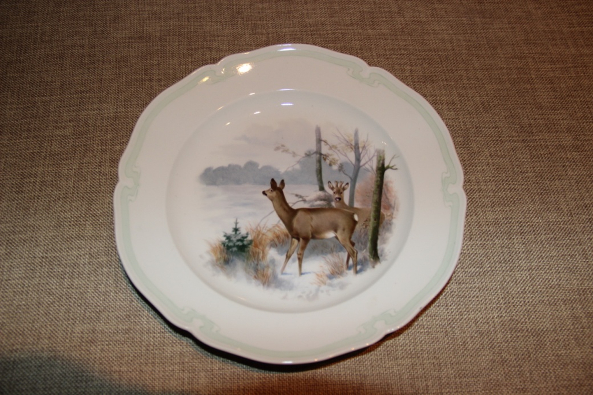 此盘花口微撇,弧壁,圈足,盘中绘有以鹿为主体的图案,栩栩如生,底部带“KPM”字样商标。由德国“柏林皇家瓷器厂”制造,此厂距今已有250余年历史,创建于1751年,1763年普鲁士国王腓特烈大帝收购,还赐予了一尊宝石蓝色的君主节杖作为商标。
