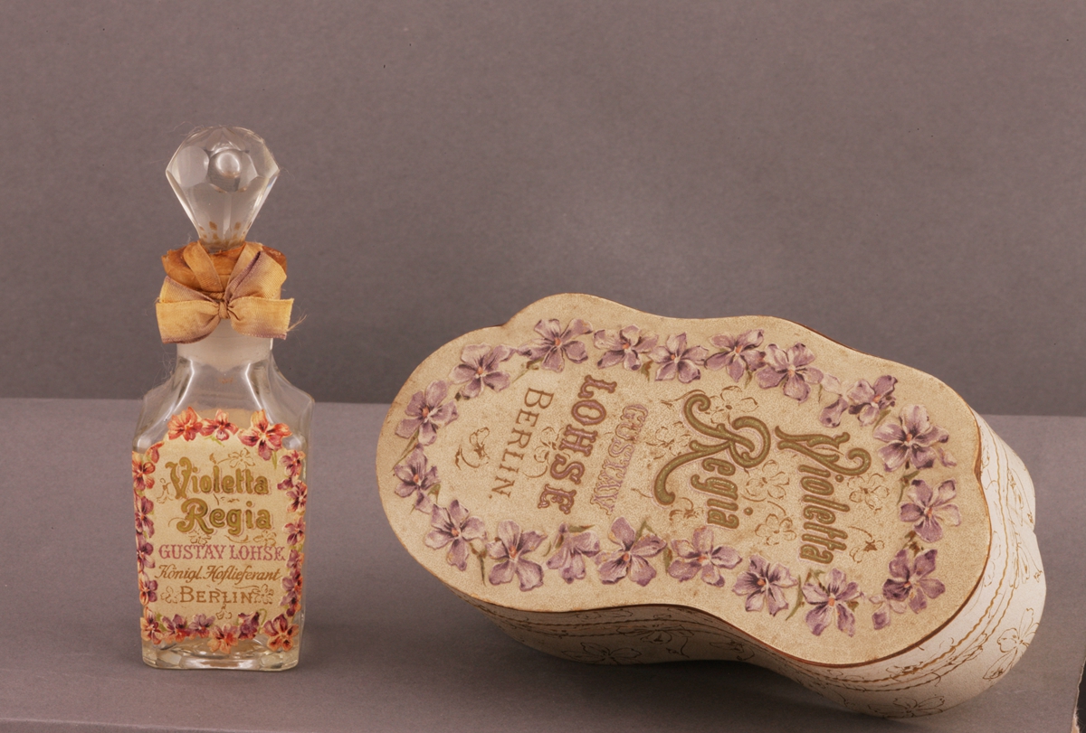 香水为西方国家使节送给清宫的礼品。单瓶装:玻璃质四方瓶体,四面坡式斜肩,带盖。附原装纸盒。