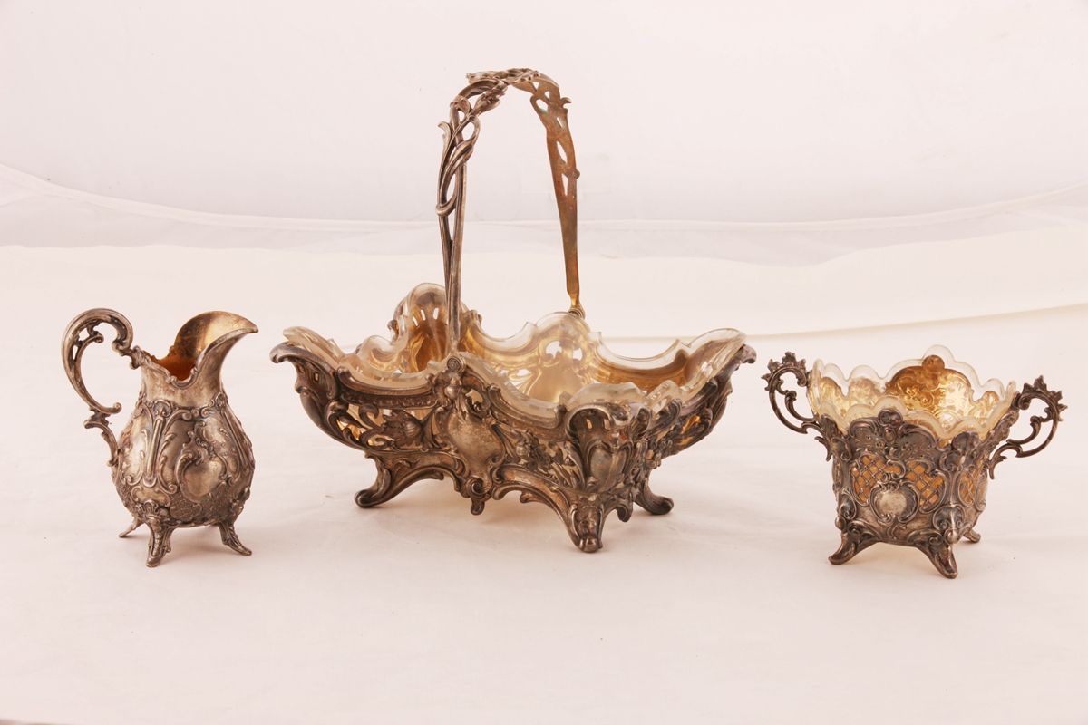 奶罐梨形腹,单执柄,口沿一侧有流。果篮、茶杯器身镂雕,内置随形玻璃内胎。此套银制品欧式风格浓郁,制作精细,雕工细腻,纹饰流畅,器形高贵典雅。