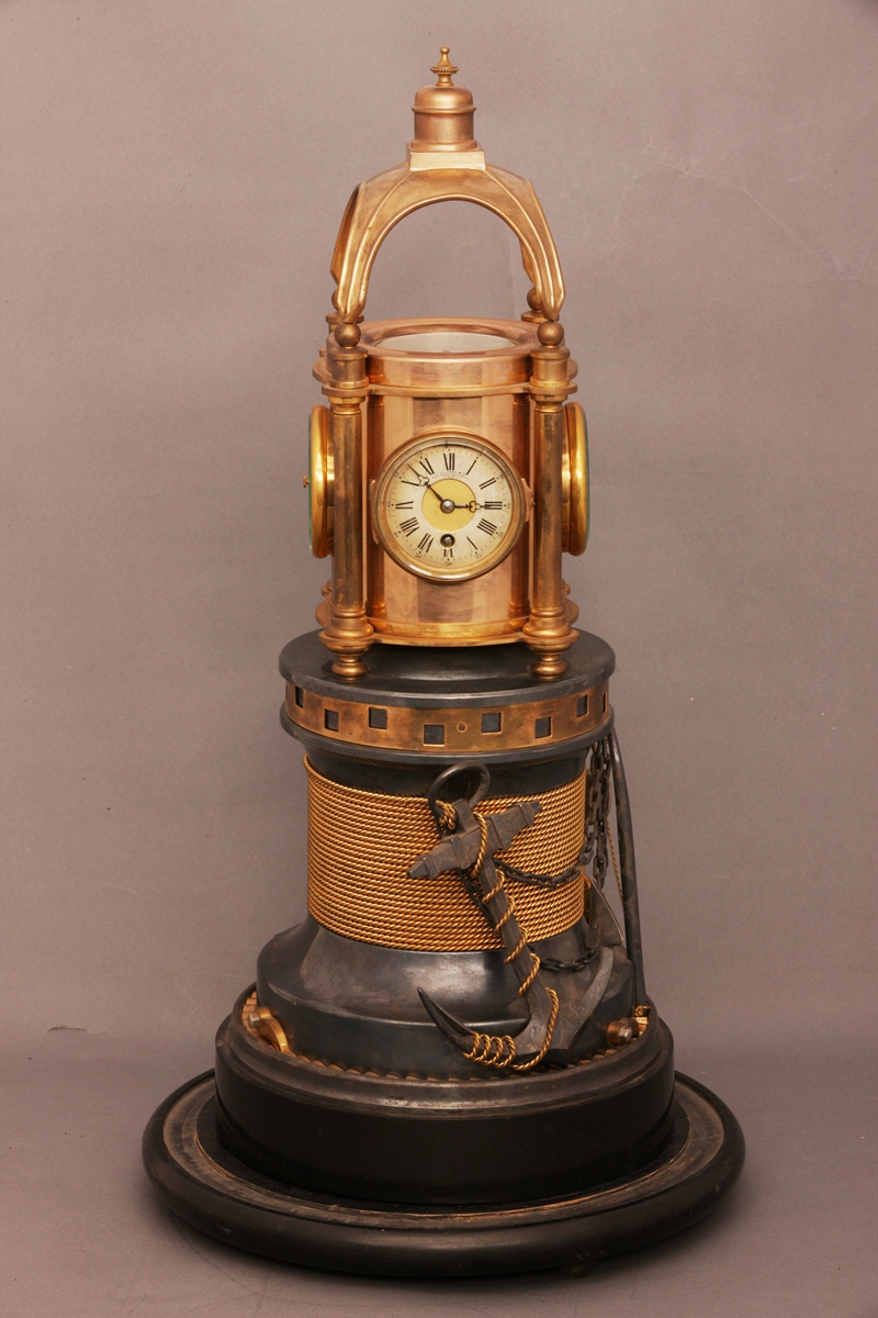 法国制造。座钟在整体灯塔造型的基础上,加以金链银锚作为装饰。正反面均为报时表,左右两侧分别为温湿度表及风雨寒暑表,顶部为指南针。