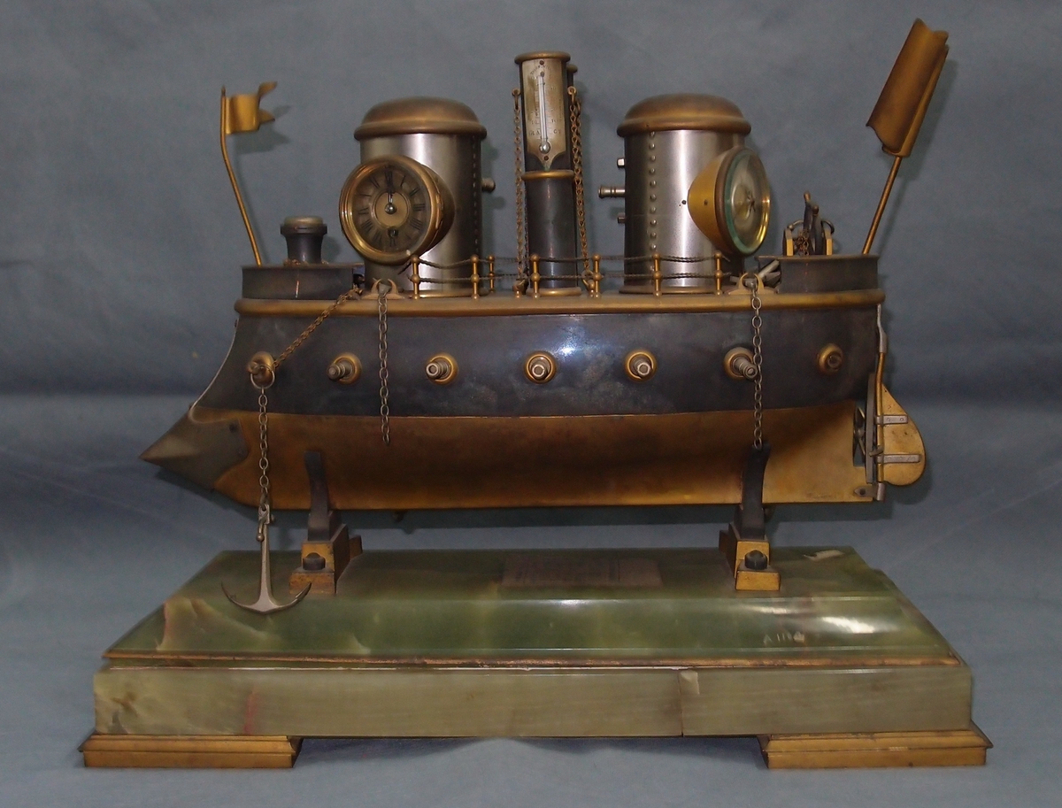 钟表外观采用汽船造型,底座为绿色大理石,甲板上两圆筒上分别嵌二针钟和无液风雨寒暑表,中间烟囱上嵌温度计,拨动船尾的船舵,船尾驱动轮转动。无液风雨寒暑表可预测干旱、晴天、阴天、雨天、暴风等气候现象。法国钟表设计极富工业化的时代感,汽船、火车、蒸汽机都是当时最先进的工业成果,法国的钟表设计充分结合了当时的工业设计,体现了欧洲工业化的成果。