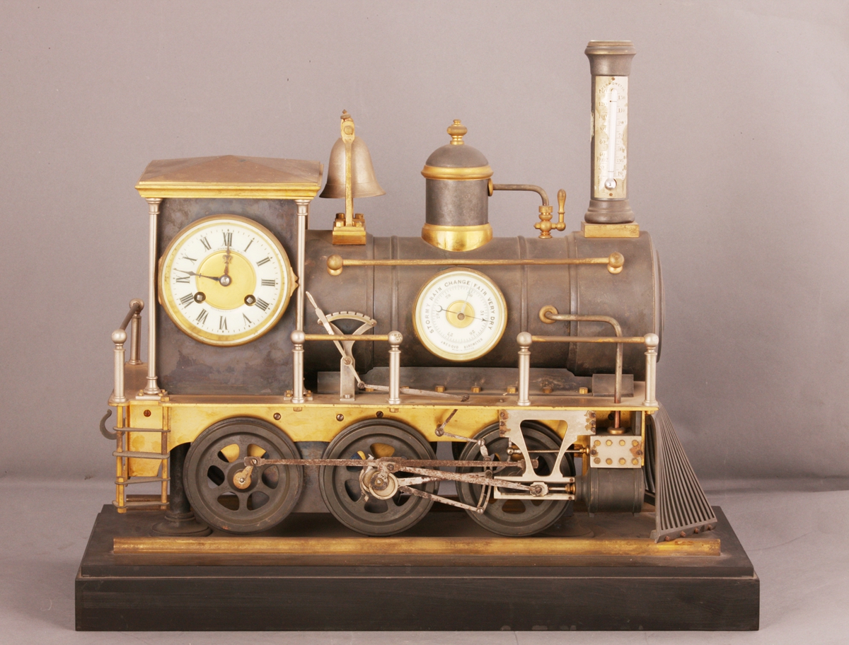 表底座为黑色大理石,火车头安设在金色铁轨上,其内装有控制车轮转动的机械系统。驾驶室门上嵌两针报时表,表有走时、报时功能。锅炉侧面嵌风雨表,烟筒上嵌温度计。上弦启动后,驱动杆带动车轮转动,犹如火车在轨道上行驶。