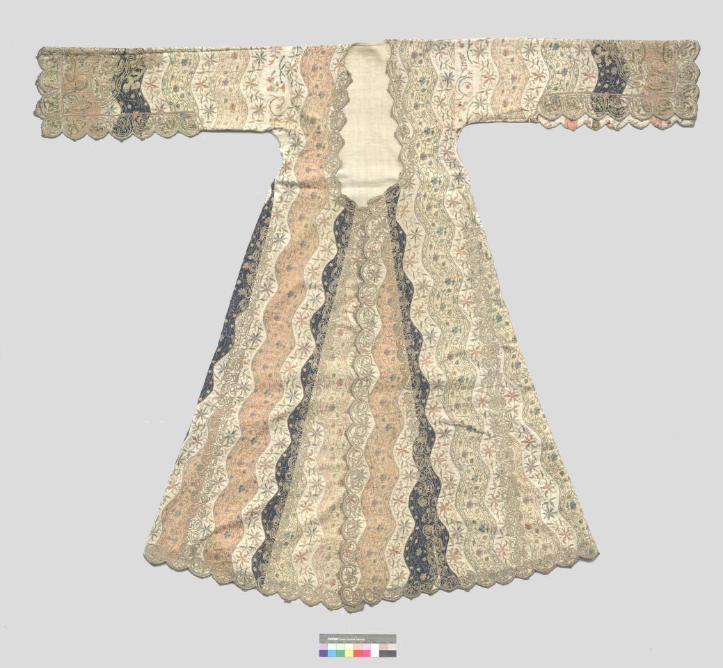 这件来自土耳其的女式刺绣礼服(见图2),运用多色丝线和金属线,在平纹棉布地上锁绣、钉绣,整体色彩柔美,做工精致。