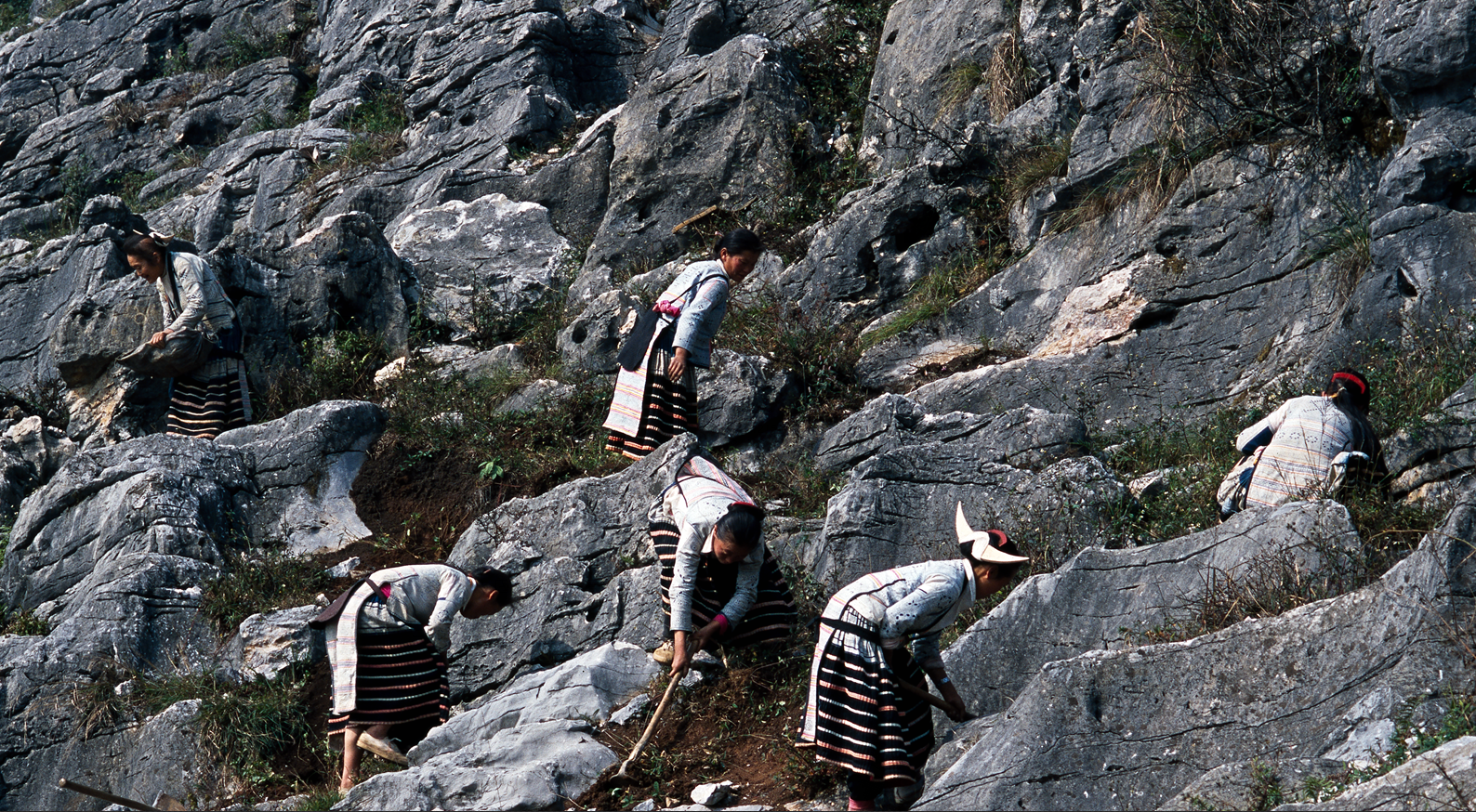 整个村寨被荒蛮的大山所困,这里曾是贵州石漠化最严重的地区之一。严重的石漠化,山上几乎不长草,裸露的岩石犹如褶皱粗糙的毛巾斜披在70度的山坡上,沟沟壑壑间藏着一块块巴掌大小的土地。 1995年摄
