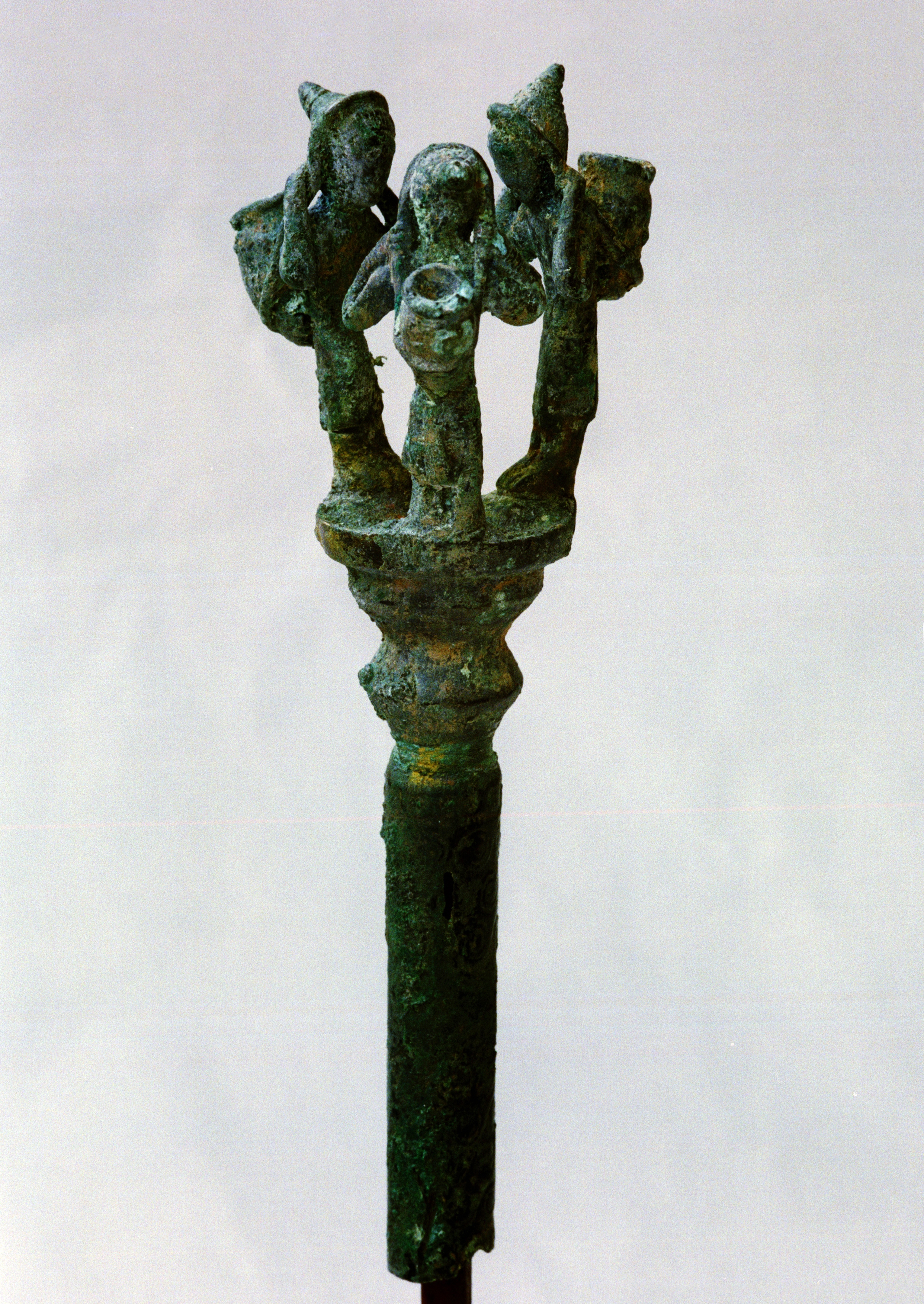 1.三人背水铜杖首:这件青铜杖首采用三人背水的独特造型,整体可分为銎部、平台和人物三部分。銎部呈规整的圆筒形,通体饰以精美的螺旋纹饰。銎部上方连接一个倒圆锥形平台,平台如竹节造型,节纹清晰。平台上三名女性呈“品”形站立,人物服饰统一:头戴尖顶小帽,身着紧身上衣,下穿及膝筒裙,裙面装饰刺绣纹样。三人各背一个敞口深腹平底水罐,背带从罐腹绕过,上端紧勒于前额。人物面部表情生动,相向而立,张口作讴歌状,整体造型富有动感和韵律美。