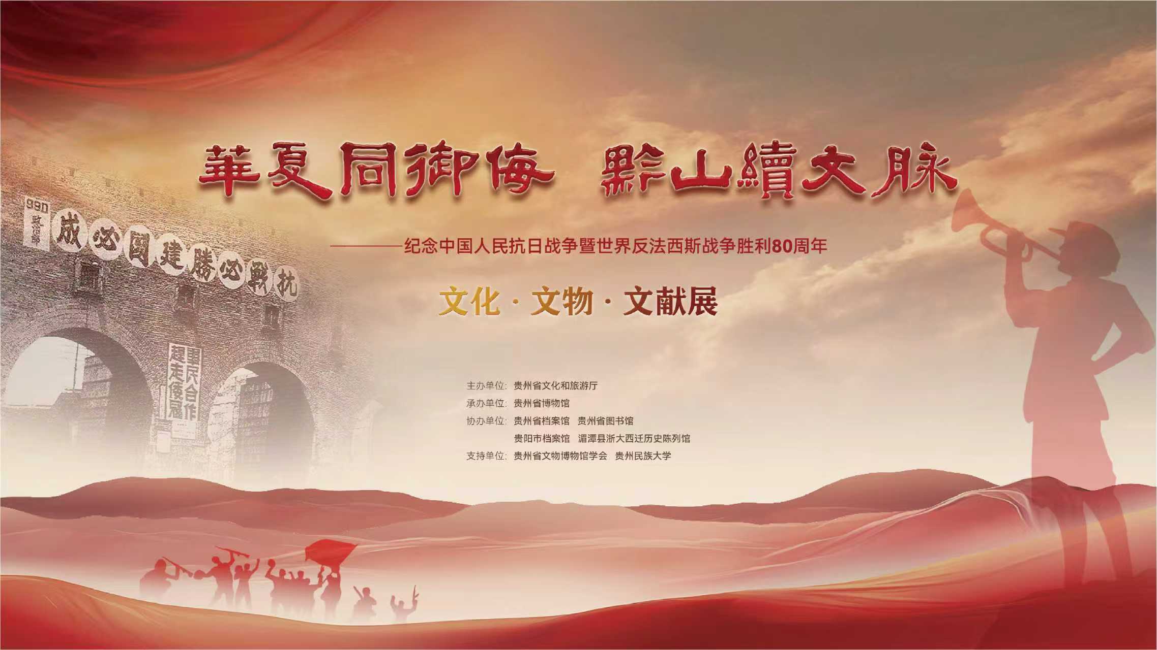 为纪念中国人民抗日战争暨世界反法西斯战争胜利80周年,由贵州省文化和旅游厅主办,贵州省博物馆承办,贵州省档案馆、贵州省图书馆、贵阳市档案馆、湄潭县浙大西迁历史陈列馆协办的《华夏同御侮 黔山续文脉——纪念中国人民抗日战争暨世界反法西斯战争胜利80周年文化·文物·文献展》,将于2025年8月15日在贵州省博物馆六号展厅开展。该展依托馆藏文物资源,讲述贵州在中国共产党领导下的抗日民族统一战线中对守护和传承中华文脉做出的贡献,彰显中华民族在危难之际,不分地域、不分党派,一致对外御敌的决心和中华文化在重重危机中依然努力生长、蓬勃发展的生命力。